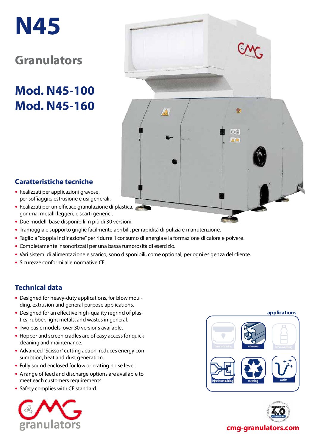 CMG designs and produces solutions for the recycling industry represented by granulators, shredders, integral feed conveyors and regrind evacuation system. CMG operates in Thermoforming, Extrusion, Blow moulding, Injection moulding, Recycling and Cables sectors.